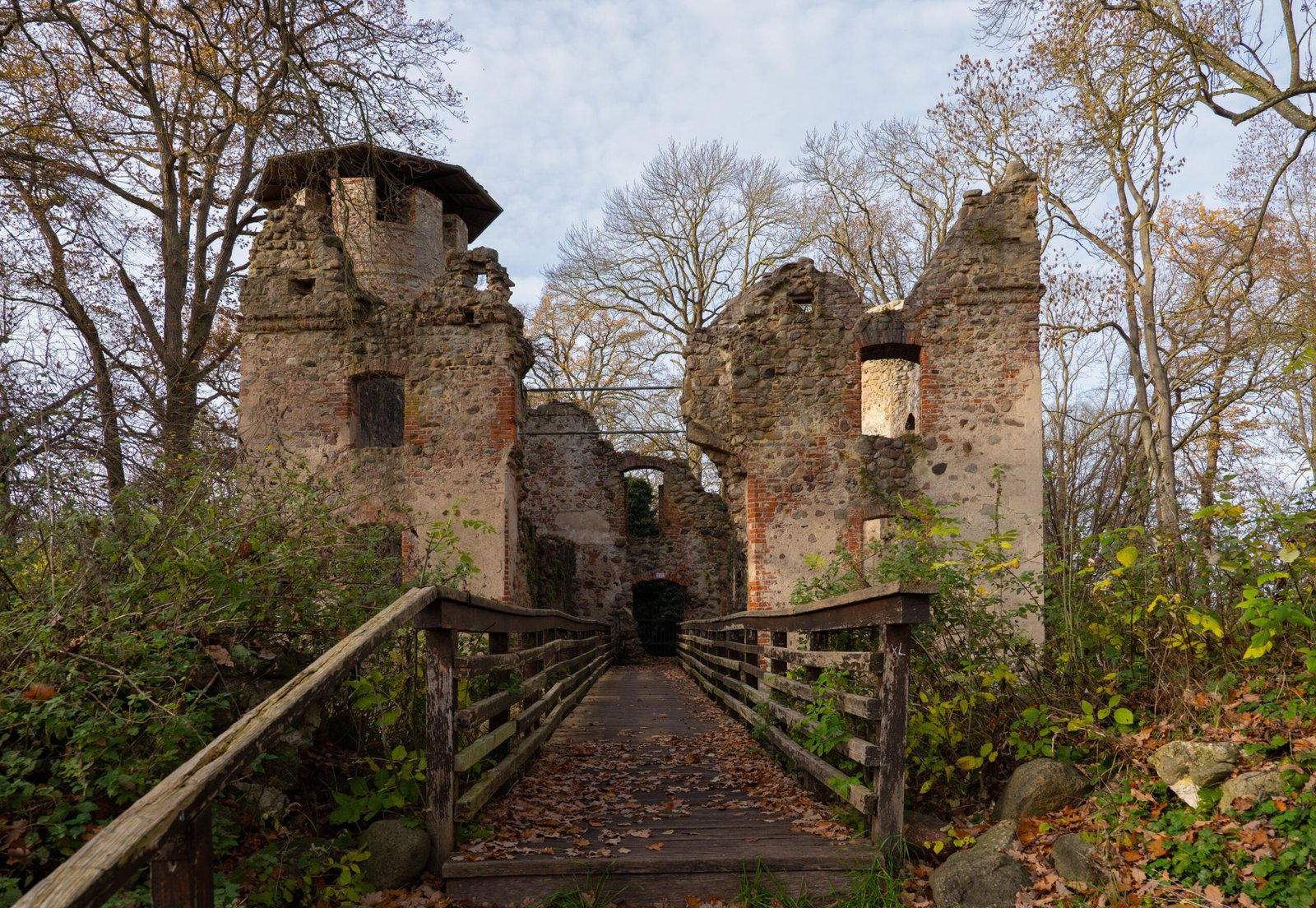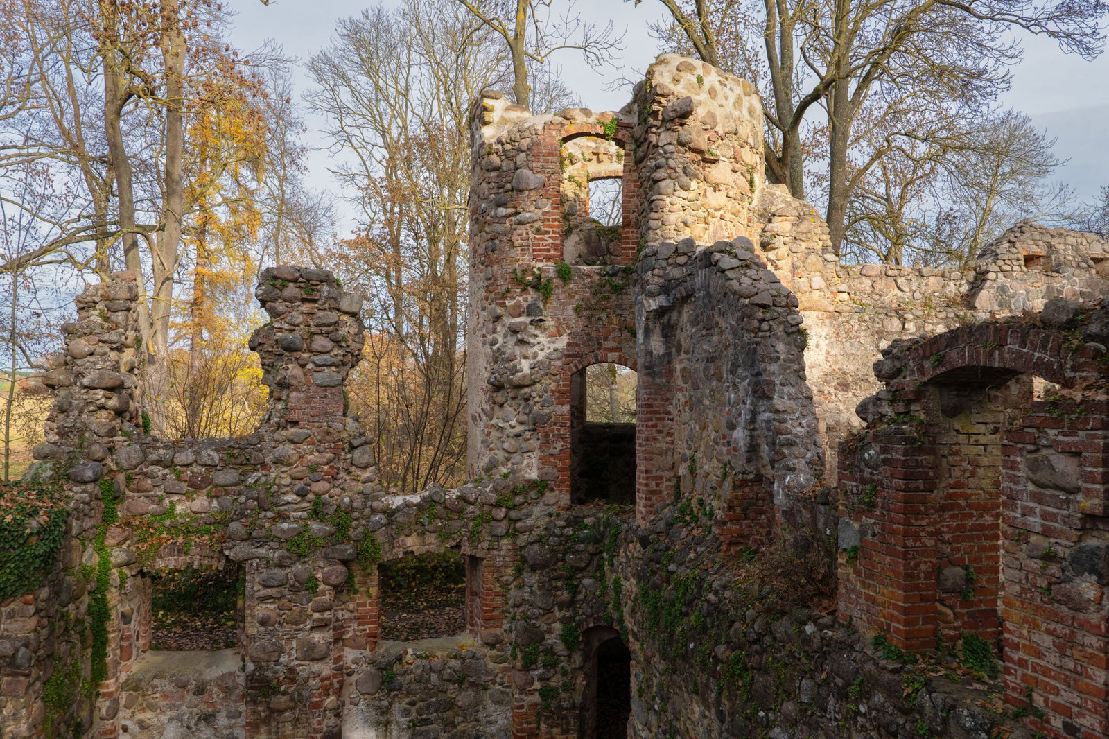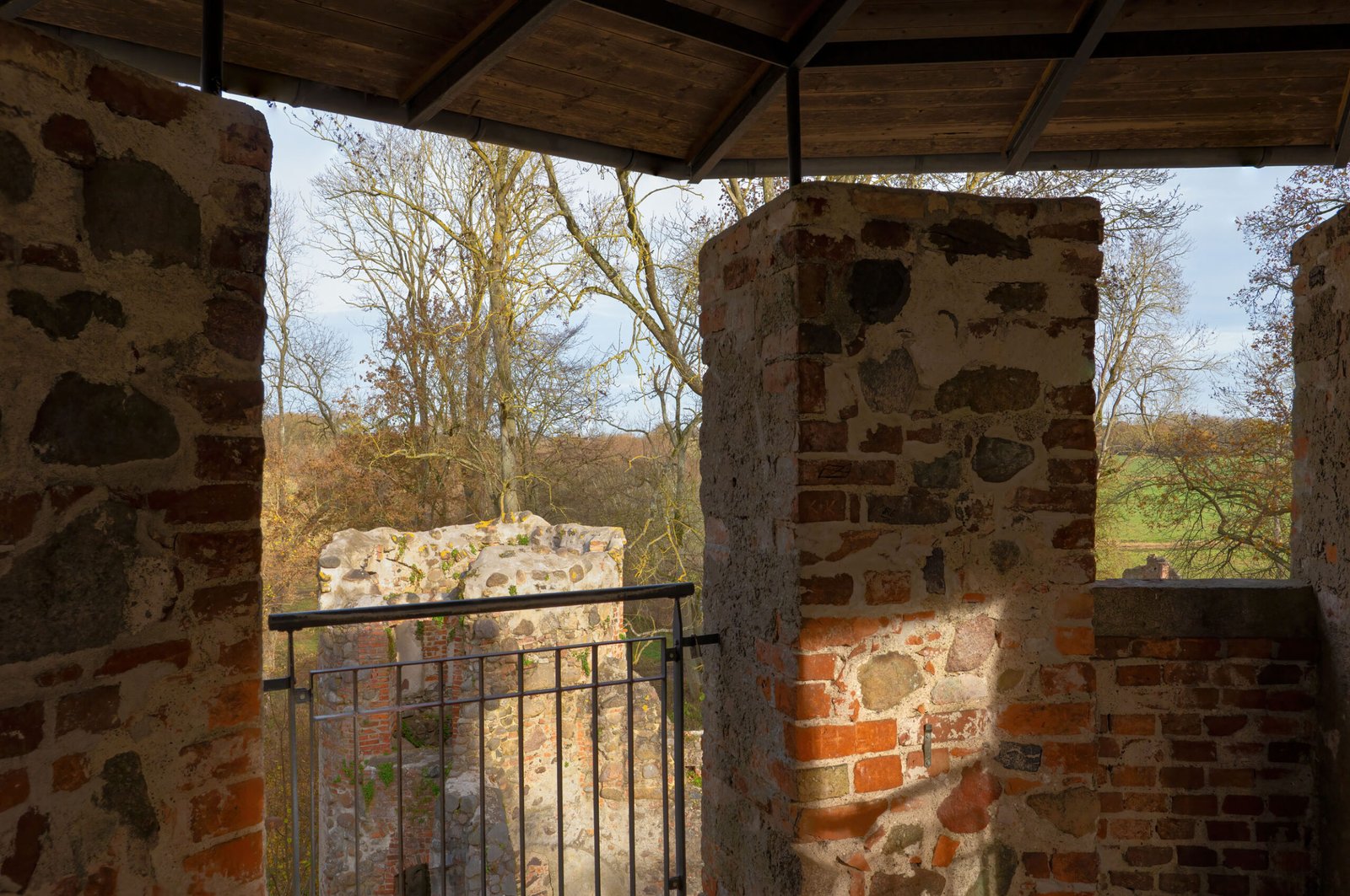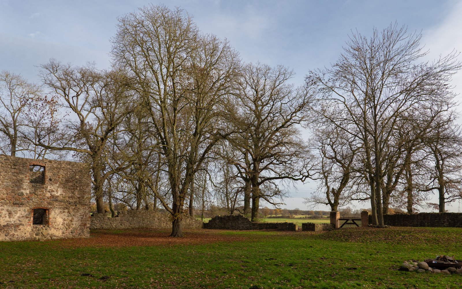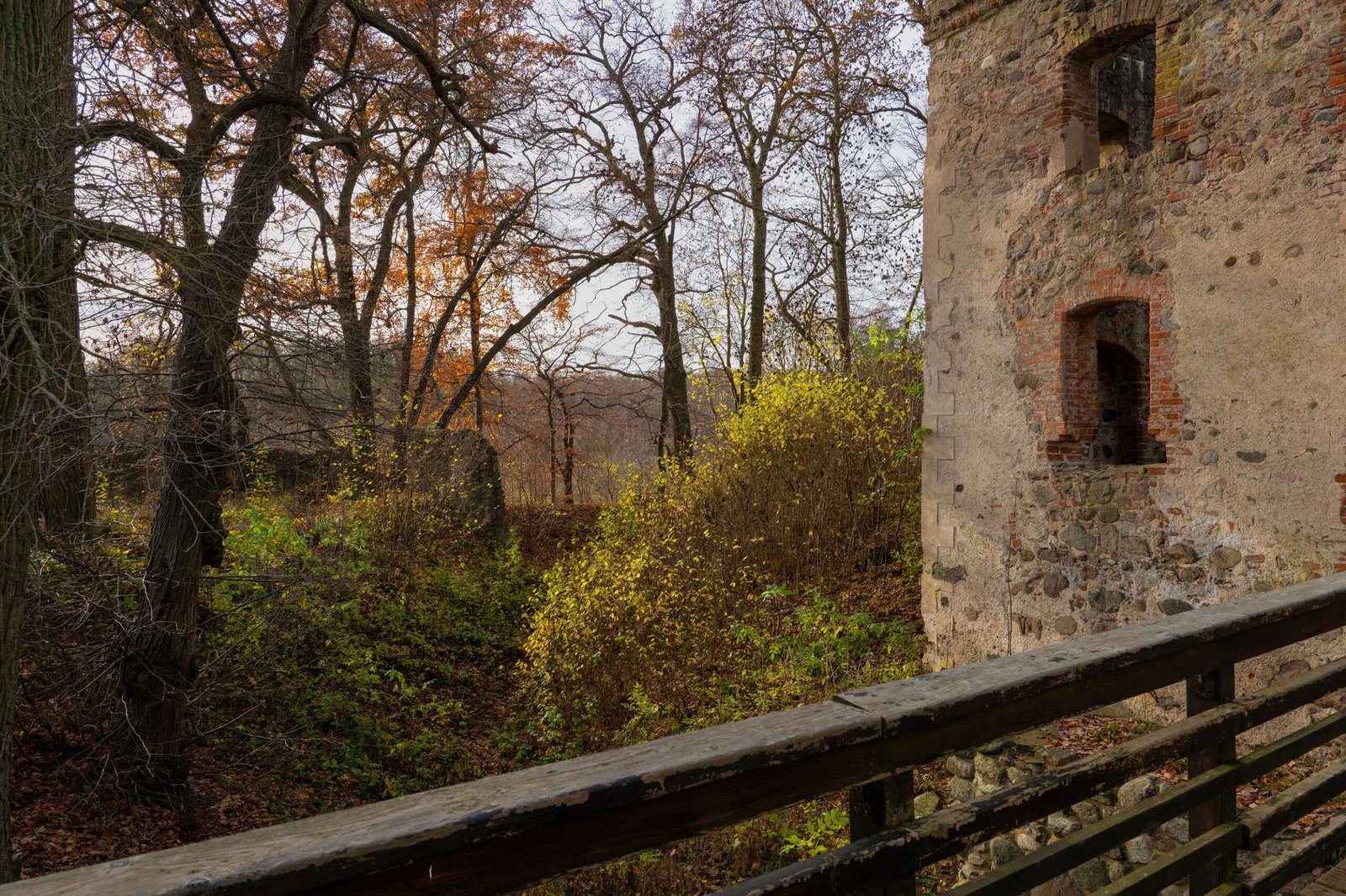 Ich bin an einem sonnigen Tag im November dort. Das meiste Laub ist schon gefallen, so dass die Burg sehr gut fotografiert werden kann. Die Festung wurde von Ulrich II. von Schwerin in den Jahren 1576 bis 1579 erbaut. In historischen Aufzeichnungen wurde die Burg später selten erwähnt. Offenbar war sie nicht Mittelpunkt irgendwelcher kriegerischer Auseinandersetzungen. Später wurde sie von Ulrichs Sohn Ernst von Schwerin übernommen.